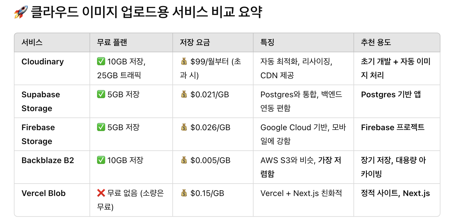 지피티가 정리해줬고 이 중에서 Cloudinary를 사용하기로 했다.
