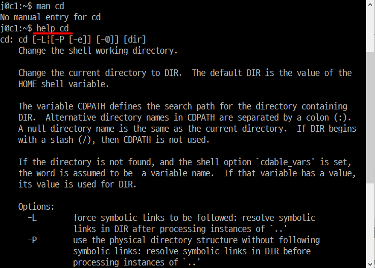 쉘 내장 명령어인 cd가 그 대표적인 예로, man 명령어를 사용하면 No manual entry for cd라는 안내가 뜬다.
