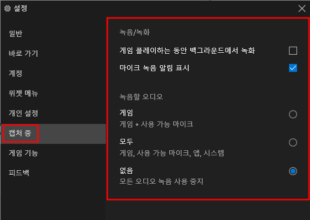 '캡처 중'에서 녹음 설정을 변경할 수 있다.