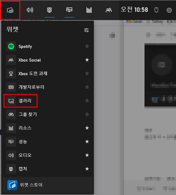또는 윈도우 키 + G키를 눌러 위젯을 켠 후 아래와 같이 '갤러리'를 열어준다.
