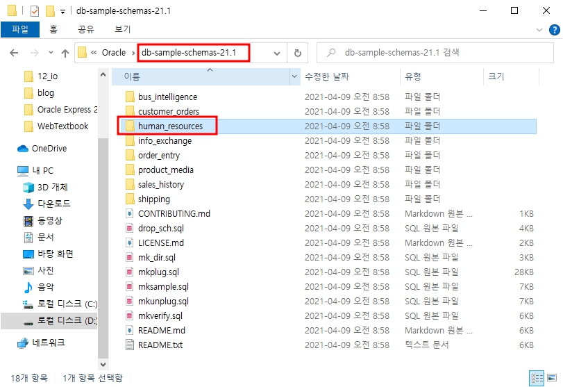 오라클 버전 18c부터는 연습용 스키마가 패키지에 포함되어 있지 않아, 따로 설치해서 사용해야 한다.