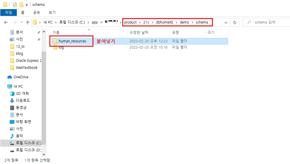 4. 오라클DB 설치 폴더에서 아래 경로대로 들어가 schema 폴더 안에 붙여넣기