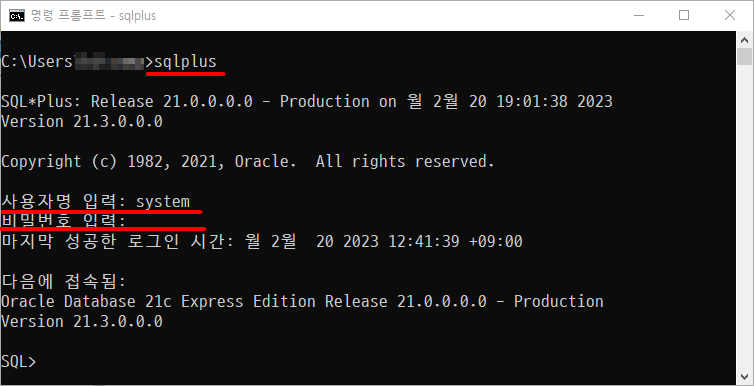 5. 커맨드창에서 sqlplus 실행하고, 관리자 계정으로 로그인