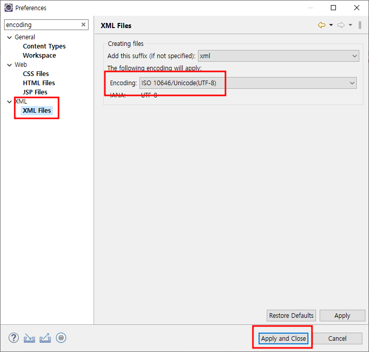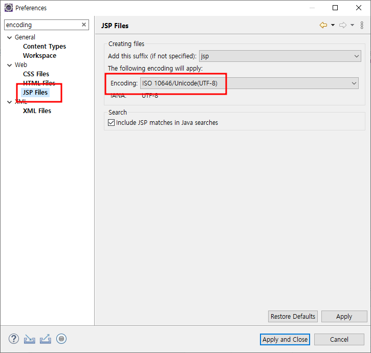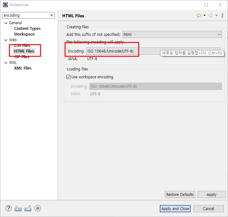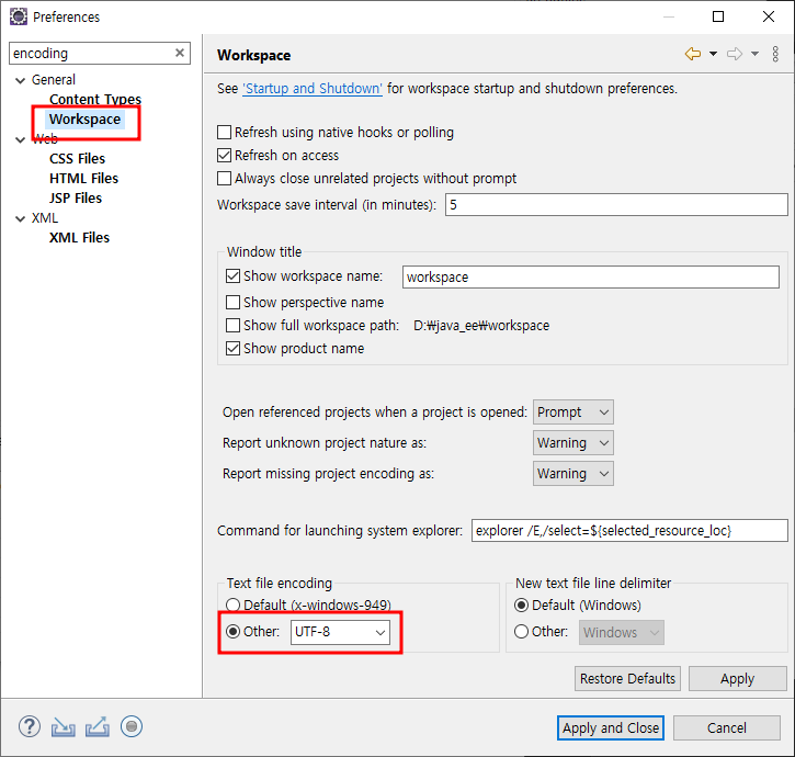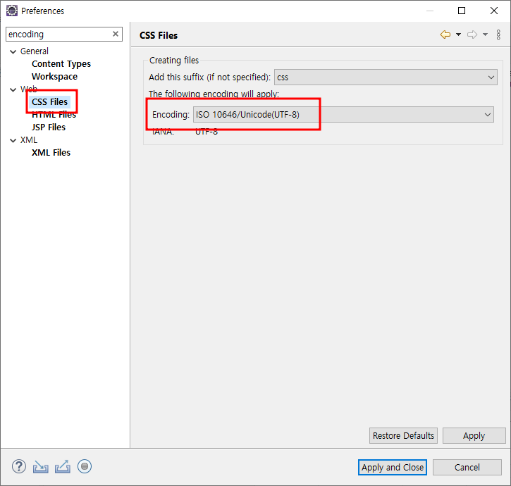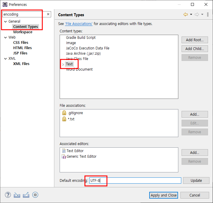 3. 결과창에서 Content Types > Text > Default encoding 입력
