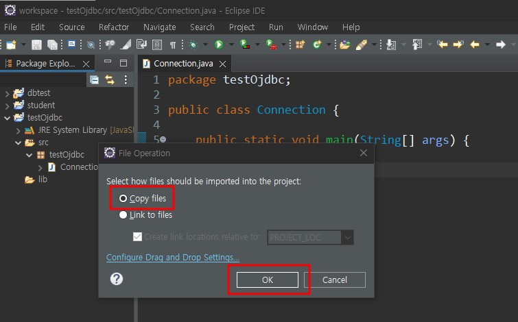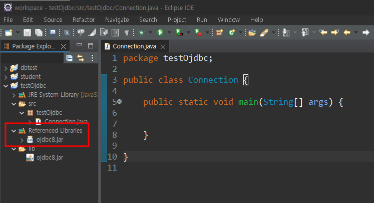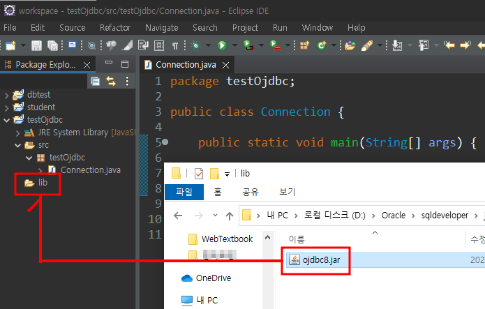 testOjdbc라는 자바 프로젝트 안에 lib이라는 폴더를 새로 만들고 그 안에 복사해주었다.