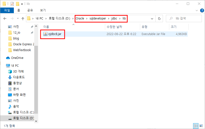 오라클 홈페이지에서 SQL Developer를 다운 받은 적 있다면 다음 경로로 ojdbc라는 이름의 jar 파일을 찾을 수 있다.