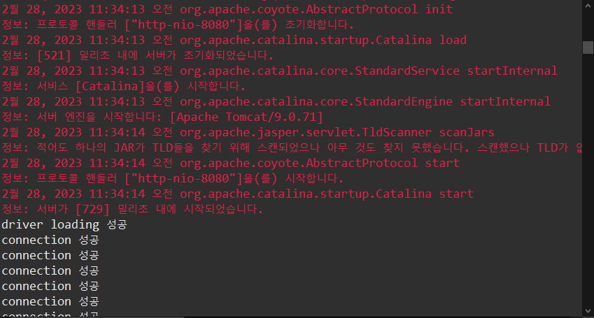 2. 아래와 같이 서버 연결, DB 드라이버 로딩, connection을 이용한 접속까지는 문제가 없다.